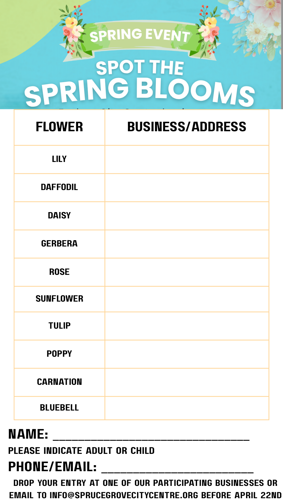 Visit City Centre businesses and Spot the Spring Blooms! Collect your entry form at one of our participating businesses, print from our website, or email info@sprucegrovecitycentre.org